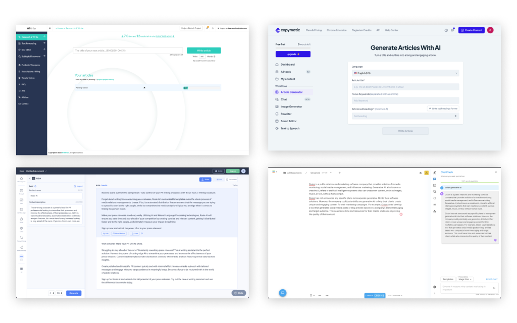 To further enhance our approach, I conducted additional market research, examining similar writing and content creation tools. This research was crucial in identifying the functionality and features that users expected in such an environment. By exploring these tools, I gained insights into industry best practices and user preferences, which informed our design decisions and helped us create a more intuitive and effective generative AI press release builder.